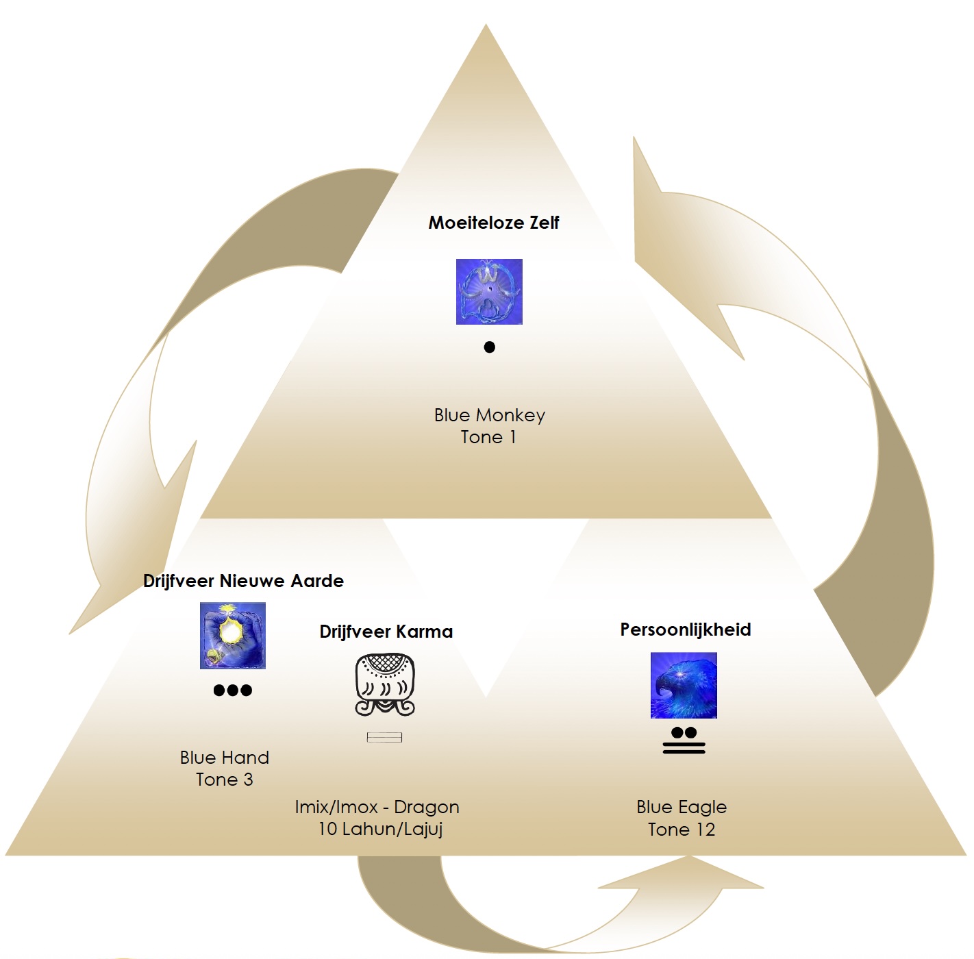 In my book Maya wijsheid voor je levenspad, het Tzolkin profielenboek (Maya Wisdom for Your Life Path: The Tzolkin Profile Book), I introduced, for the first time, a triangle containing the three counts. This triangle is a combination of your birth energy (seal and tone) according to the Dreamspell count, the Traditional Quiché count of the ancient Maya, and the Cosmic Count, which was introduced by Marc Smulders in 2008.